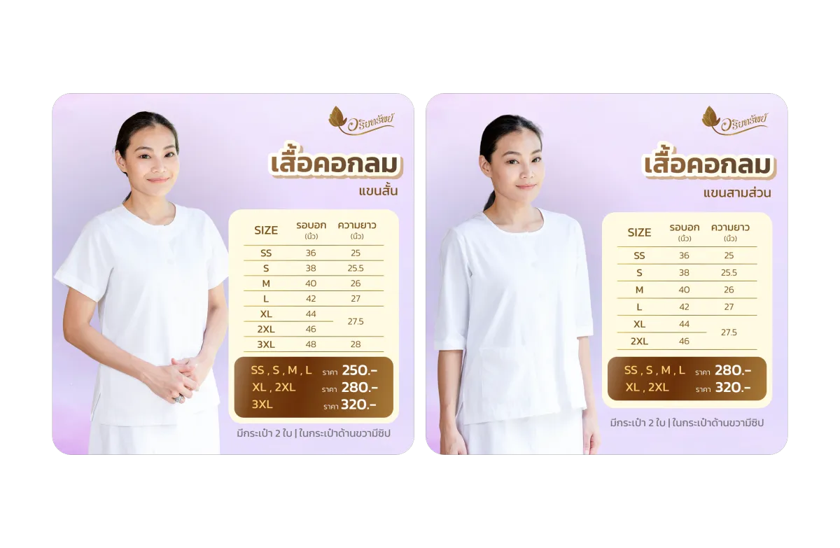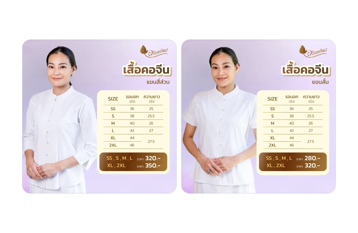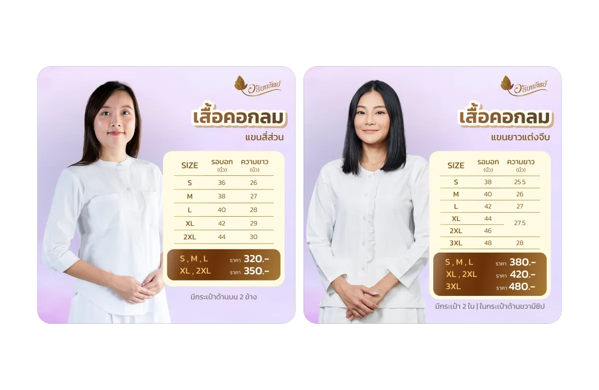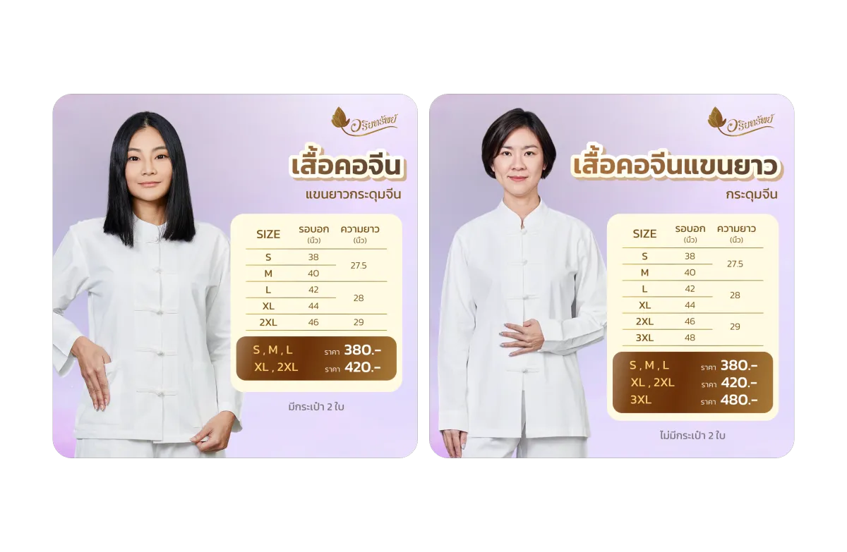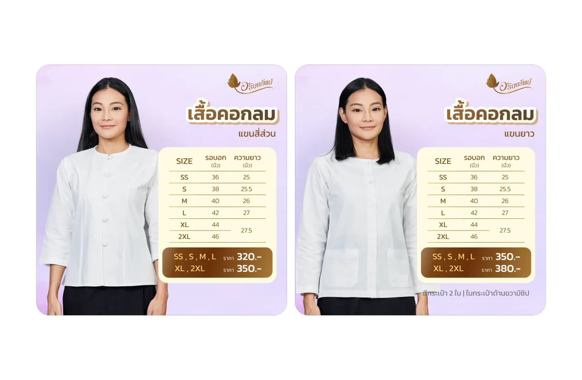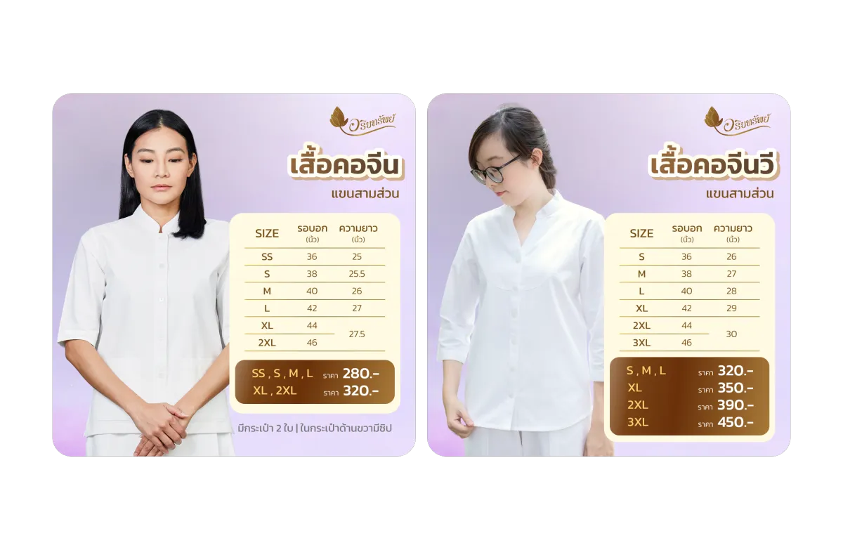 ปัจจุบันเราจำหน่ายออนไลน์เป็นหลัก ยังไม่มีหน้าร้านทดลองชุด แต่เรามีภาพสินค้าและขนาดชัดเจน