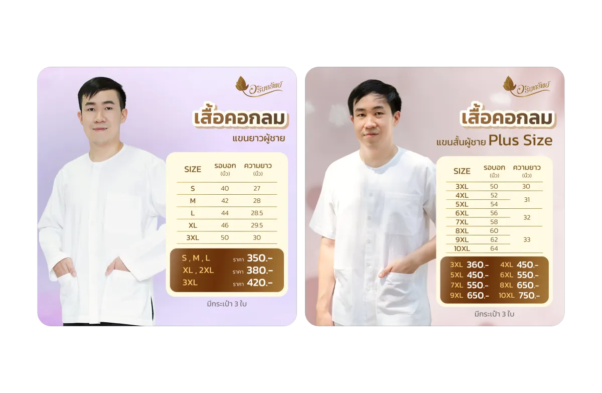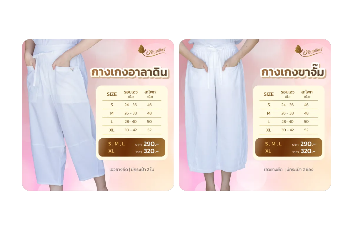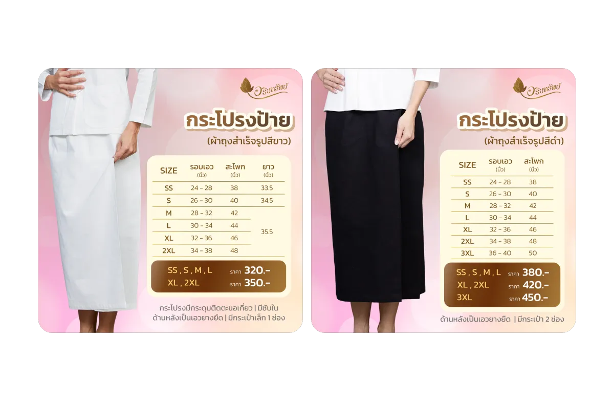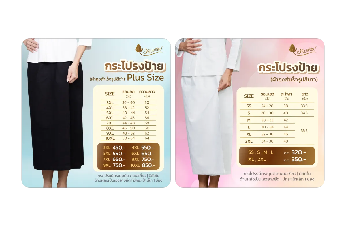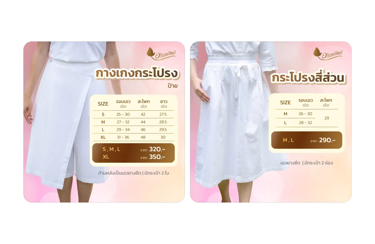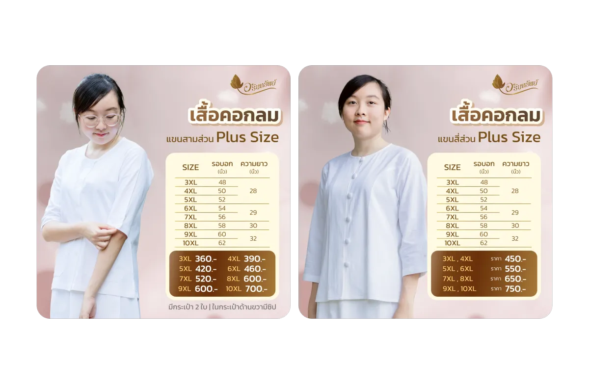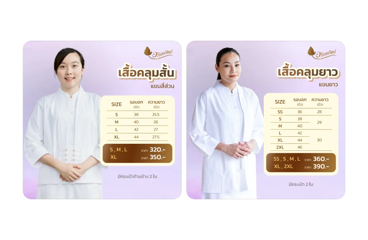 ปัจจุบันเราจำหน่ายออนไลน์เป็นหลัก ยังไม่มีหน้าร้านทดลองชุด แต่เรามีภาพสินค้าและขนาดชัดเจน